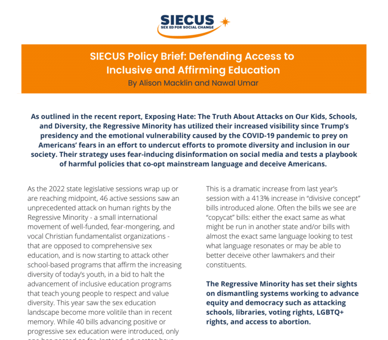 SIECUS Policy Brief: Defending Access to Inclusive & Affirming EducationMay 19, 2022 The Legislative Tracker from the Equality Federation can be accessed… Read More >SIECUS Policy Brief: Defending Access to Inclusive & Affirming Education